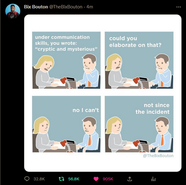 A common characteristic of certain parts of Twitter involves small, low follower accounts tweeting something funny or smart, only for a large account to steal their tweet and pretend it is their own, where normally the big account will get several more tweet “impressions” than the small account. I believe this is roughly what Bix did to Miranda Kline, and subsequently to the discussion meetings about her, where he got several of his ideas for Mandala. As this tweet shows, I think Bix would have been one of those big accounts that stole jokes and tweets from other smaller users, in this case he has taken a comic from @nathanwpyle and watermarked it as his own work.