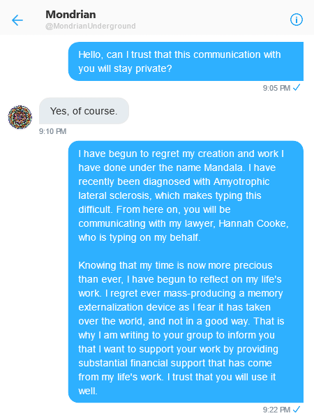 Finally we also have a private conversation with the group called “Mondrian,” the group that is actively going against what Mandala wants. I think Twitter would have been an obvious place to get in touch with Mondrian, as Twitter moves to end-to-end encryption DMs that would have made this communication secure and safe. While it might not be the only place for him to get in contact with Mondrian, Twitter is also a great social media site to get in quick contact with large organizations that might normally take jumping through a lot of hoops to call or meet with.