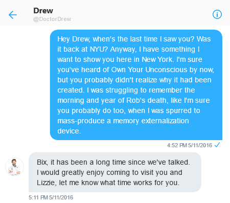 One of the more unseen parts of Twitter is its use as a direct messaging service. This is where I think Bix would have spent a lot of his time on Twitter because as mentioned above, he was a very private man (286). I believe one of the messages that had to be sent was his message to Drew, one of his best friends from college. I imagine this conversation between Drew and Bix to be quite short because each of them are too afraid to ask the other what they truly think about Rob’s death. Which is shown even when Drew is watching Bix’s memory as Bix has “silenced the thought-and-feeling” (58) part of his consciousness.