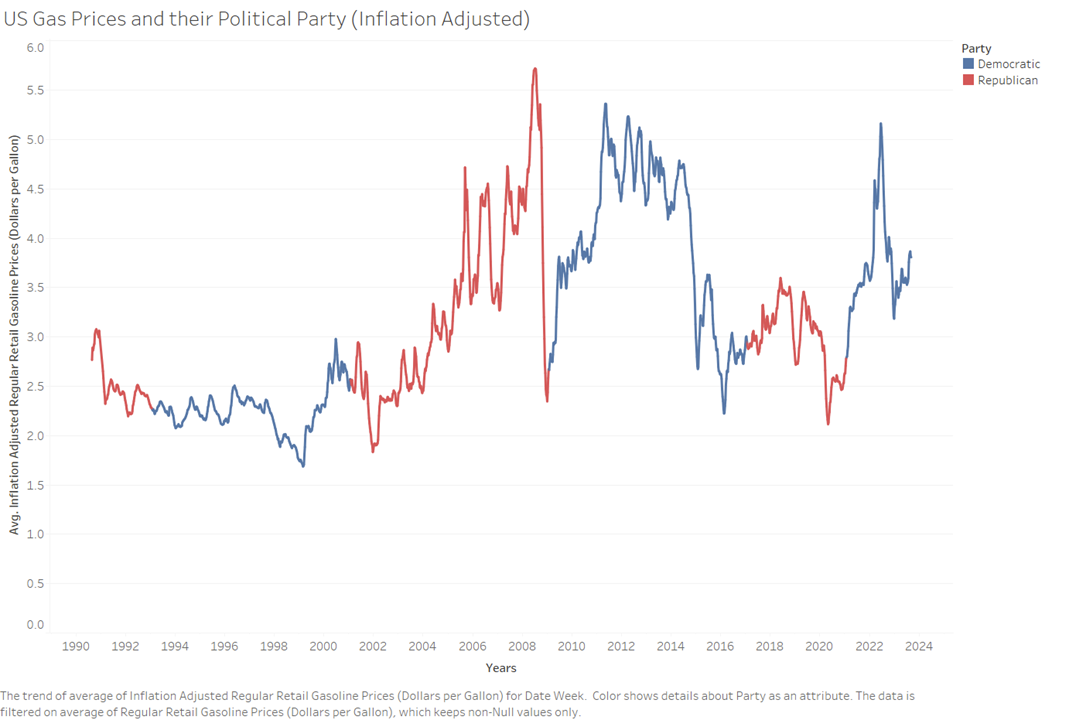 I created a series of visualizations to explore the relationship between US gas prices and the political party in office, with a focus on inflation-adjusted gas prices. These visuals provide insights into how gas prices have evolved over time during different presidential administrations and whether there are significant differences between Democratic and Republican presidencies.