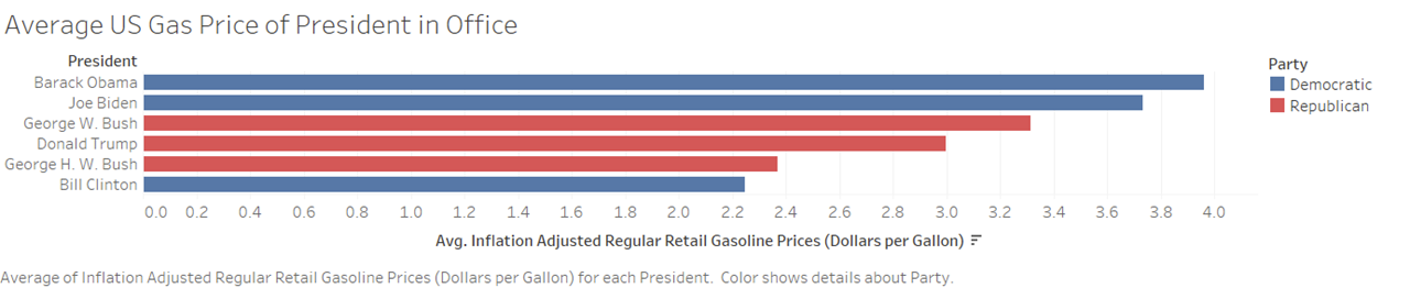 - Bar Chart - Average Gas Prices by President: The bar chart displays the average gas prices during each president's term. This chart allows viewers to easily compare the gas price performance of different presidents.