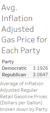 - Table - Average Inflation-Adjusted Gas Prices by Political Party: The table summarizes the average inflation-adjusted gas prices during Democratic and Republican presidencies. By presenting this data in a table, viewers can quickly discern that while there is a slight difference in average prices, it's relatively small (only a 13 cent difference).